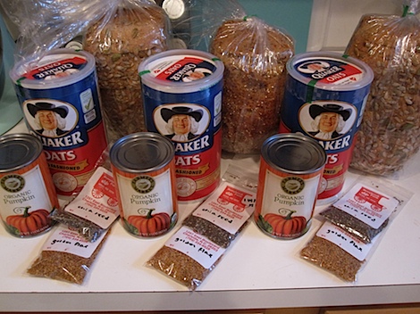 Inside: Old fashioned oats, canned organic pumpkin, a loaf of Great Harvest bread…
