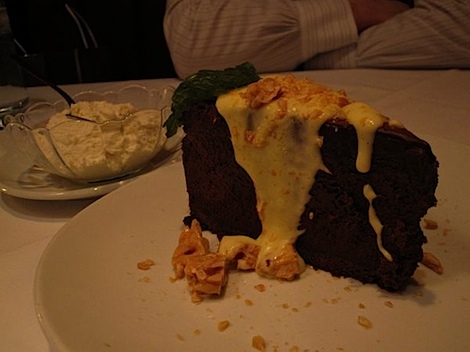 Dark Chocolate Mousse cake with almond brittle and malted creme anglaise...holy wow! So good! Perfect-o with that cappuccino!